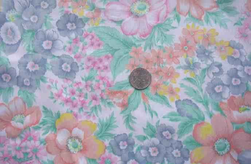 This is a lovely Pastel Floral Cotton Sateen Fabric with subdued shades of pink, peach, blue, coral, and yellow with green foliage. Has a subtle sheen and a wonderful drape. Suitable for dresses, blouses, childrens clothes, etc.